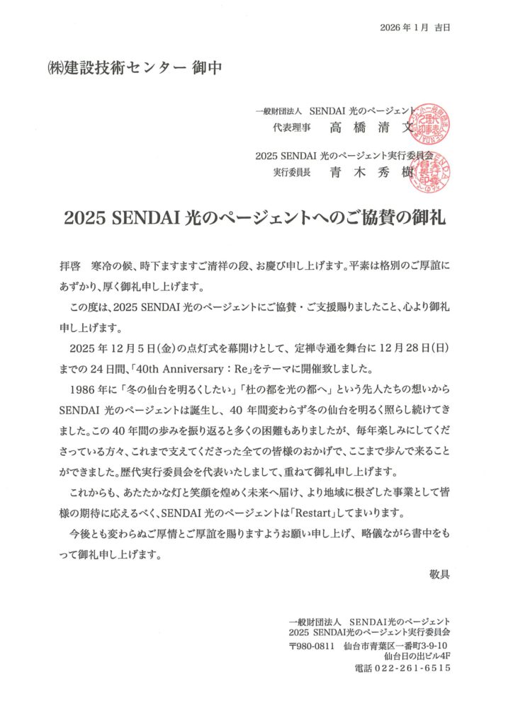 [ブログ] 2025 SENDAI 光のページェントへのご協賛のお礼状